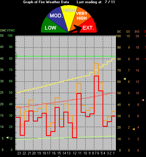 Last Updated: 7 11 at noon Current Weather conditions TEMP(°C) RH(%) WIND(Km/h) Direction 24 hour rain(mm) 10.8 70 16.3 290 0.0 Yesterdays values FFMC DMC DC ISI BUI FWI 82.3 6 78 2.9 10 2.9 Todays values FFMC DMC DC ISI BUI FWI 82.3 6 80 3.3 10 33.0![]()